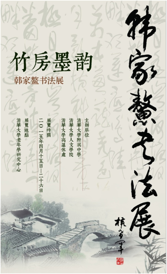 竹房墨韻——韓家鰲書法展將于2015年4月15日(星期三)上午10:00在清華大學舉辦開幕式,此次展覽是韓家鰲先生人生第一次個人展覽,集中展示了韓家鰲先生的楷、行、隸、篆、草五大書體作品共80余幅。其楷書作品清新雅淡,穩重古秀;行書飄逸灑脫,端莊儒雅;隸書厚重沉穩,圓融勁健;篆書古拙渾穆、井然有序;草書飛逸靈秀、字勢險峻跌宕,剛柔相濟、出神入化,于浩然正氣中顯風骨,有一種奇峰交錯、萬壑奔流的氣勢。從多角度闡述了自己對書法的個性理解,呈現出這個時代特色的書風。本展覽將從2015年4月15日正式開放,展期10天。