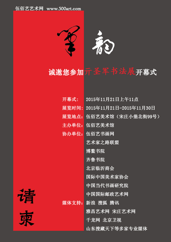 展訊:由伍佰藝美術館主辦的“筆韻”亓圣軍書法作品展將于2015年11月21日上午11點在北京市通州區宋莊伍佰藝美術館開幕。據悉,伍佰藝書畫網、博鰲書院、藝術家之路聯盟、北京臨沂商會、齊魯書院、國際中國美術家協會、中國當代書畫研究院、中國國際郵政藝術網、中國國家藝術研究院、中國新幻彩藝術研究院等機構對此次展覽給予了大力的支持。